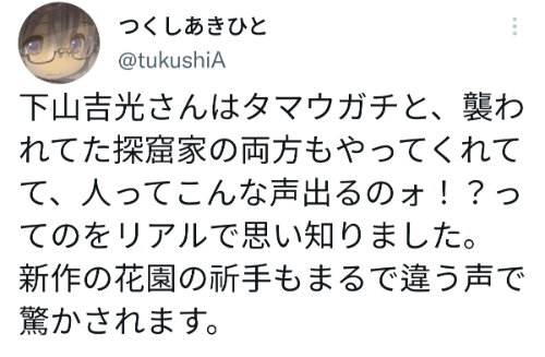 시모야마 요시미츠씨는 타마우가치와, 습격당한 탐굴가. 양 쪽 모두 해주어서, 사람에게서 이런 소리가 나오는거야?! 라는 걸 실감했습니다. 신작(여명극장판)의 화원 기수도 전혀 다른 목소리라서 놀랐습니다.